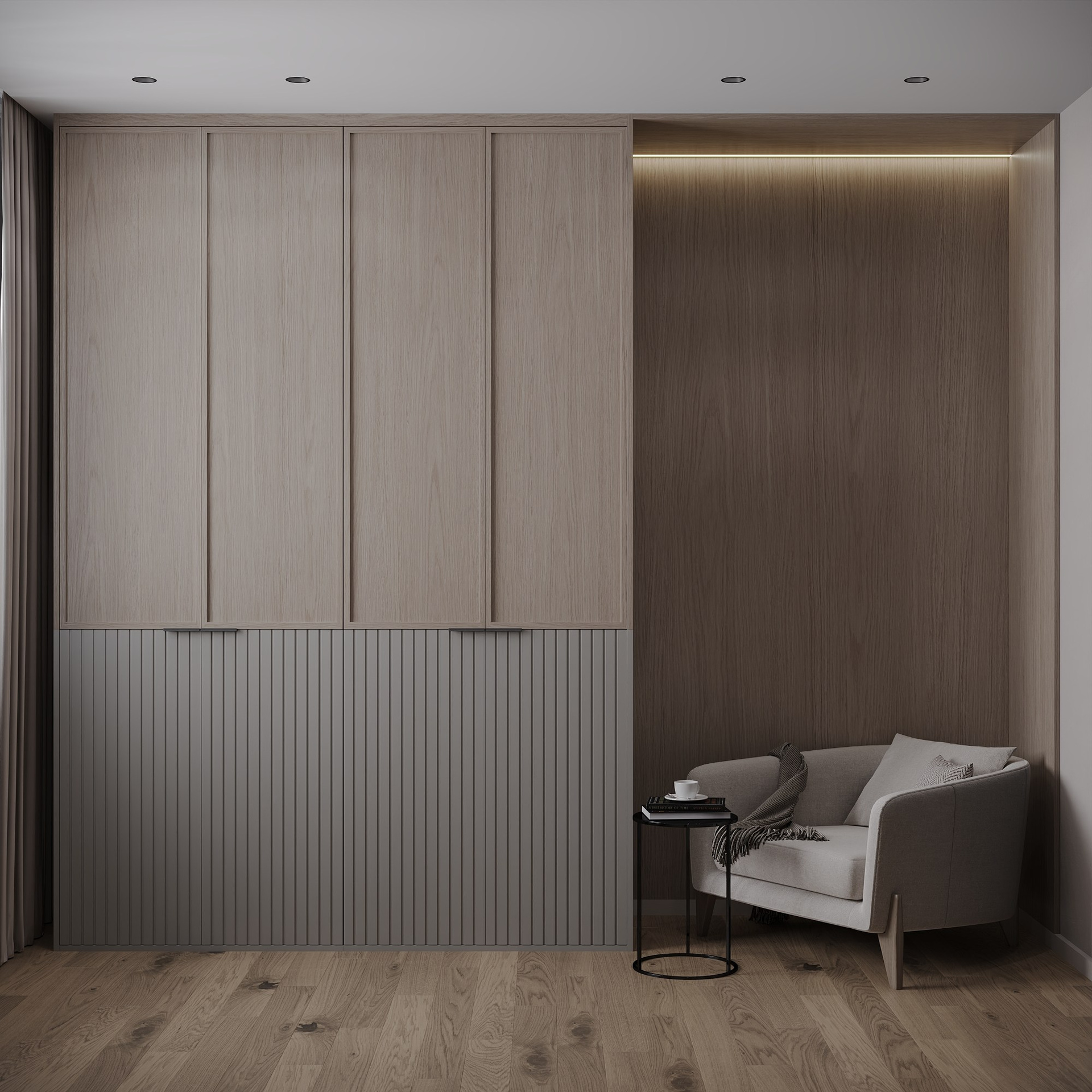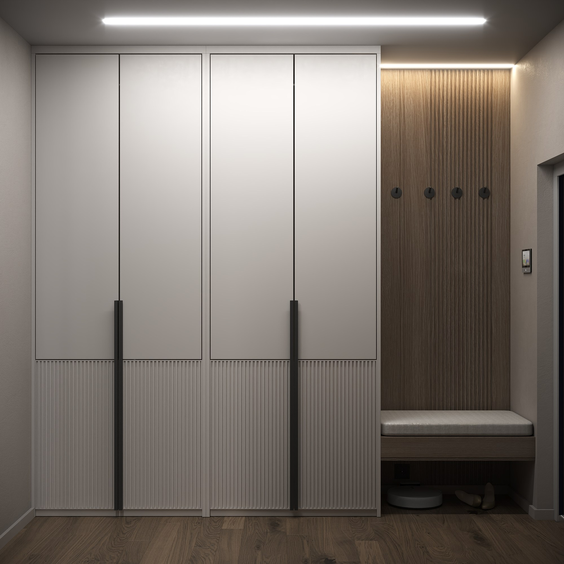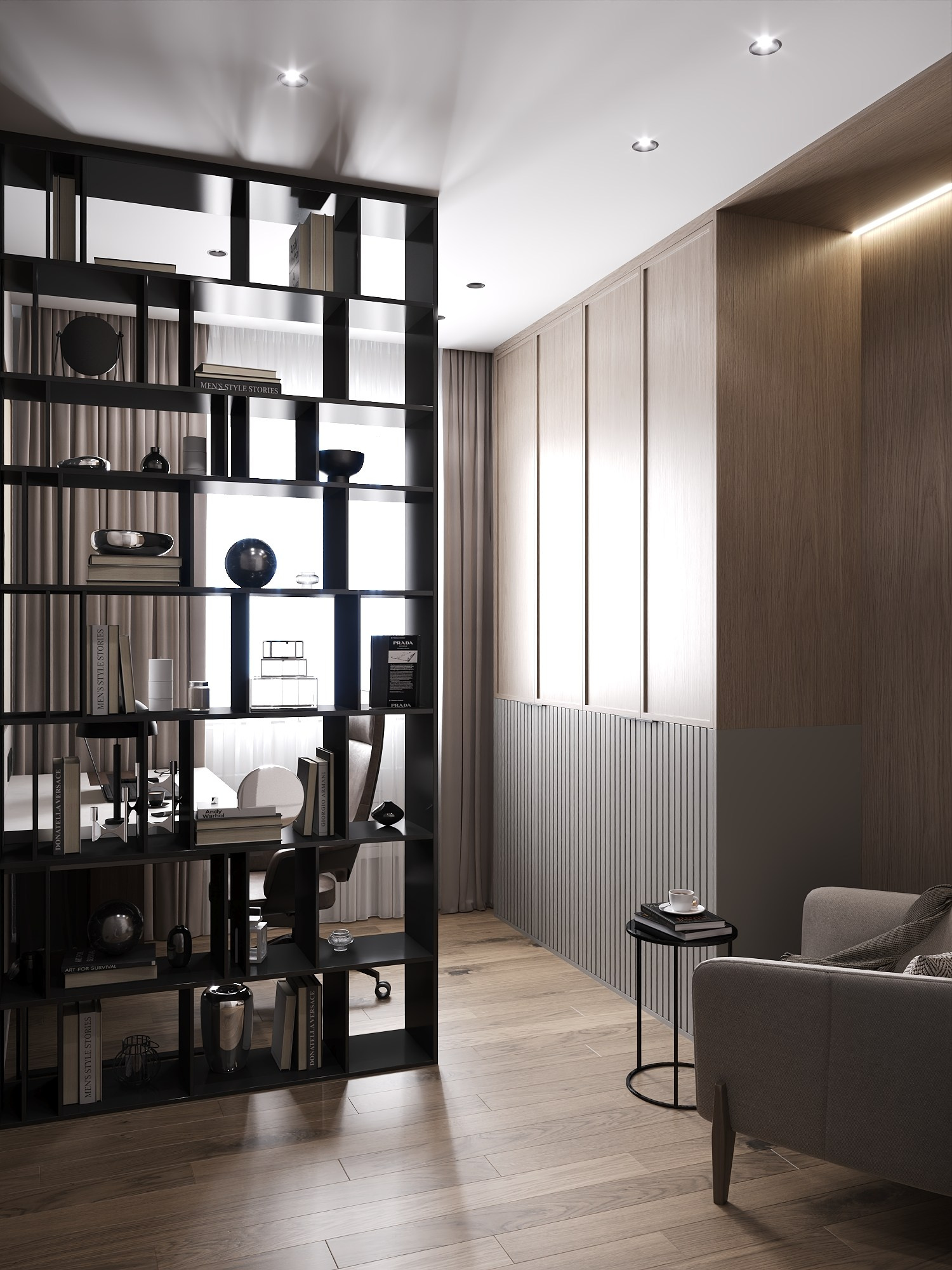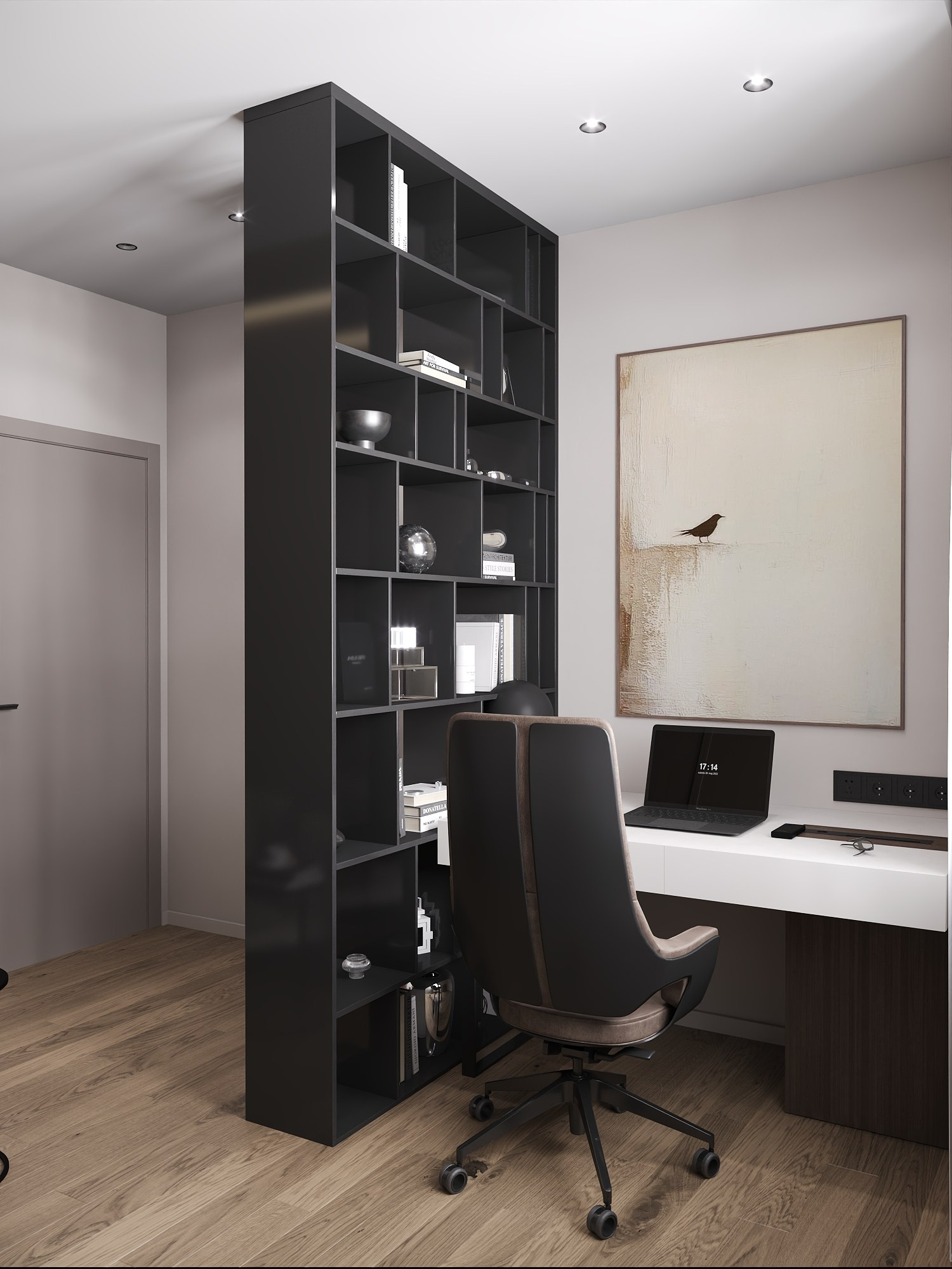 Разработана планировка с четким функциональным зонированием: оборудован отдельный кабинет с эргономичной рабочей станцией и шкафами для хранения спортивной экипировки.