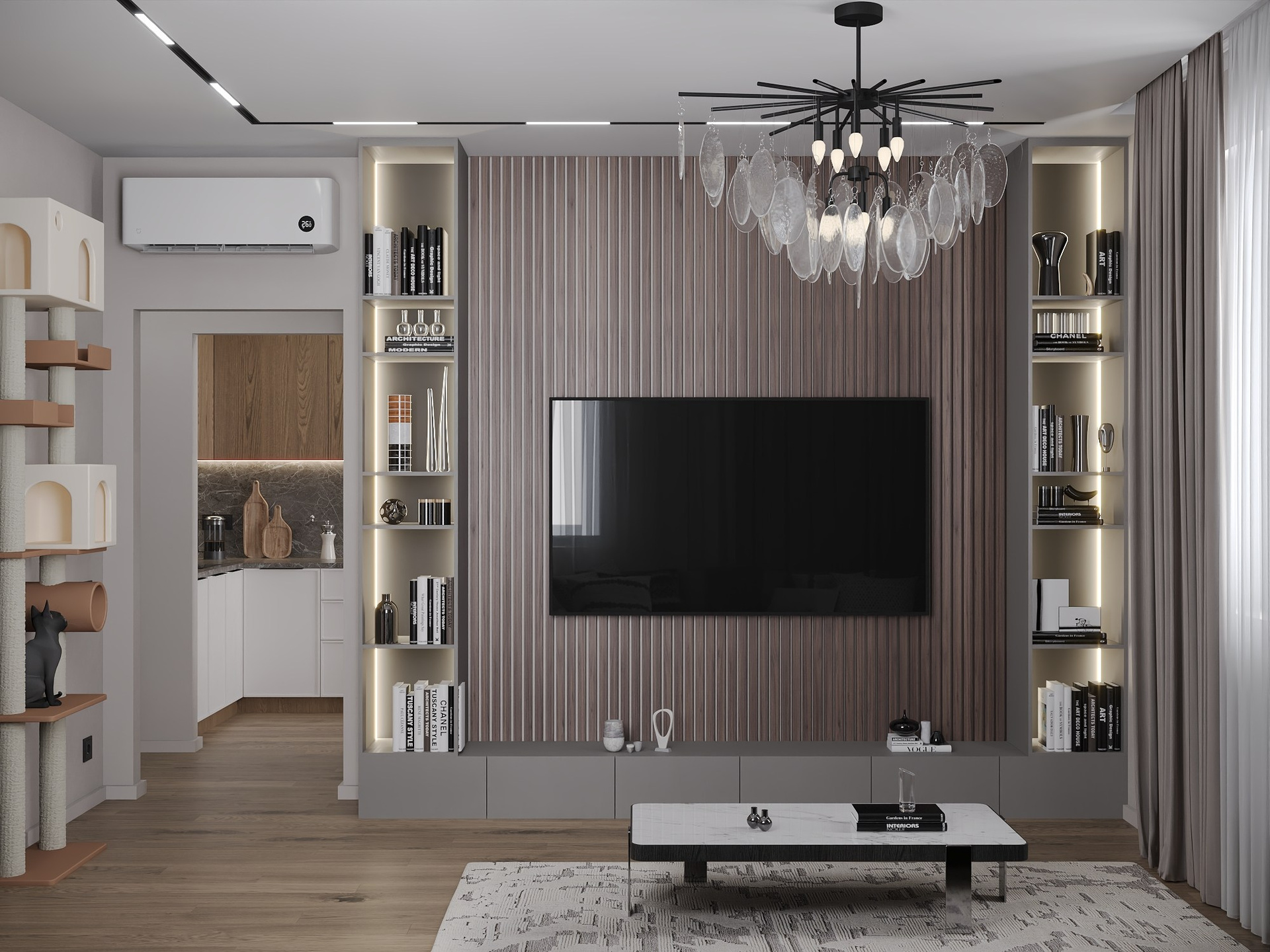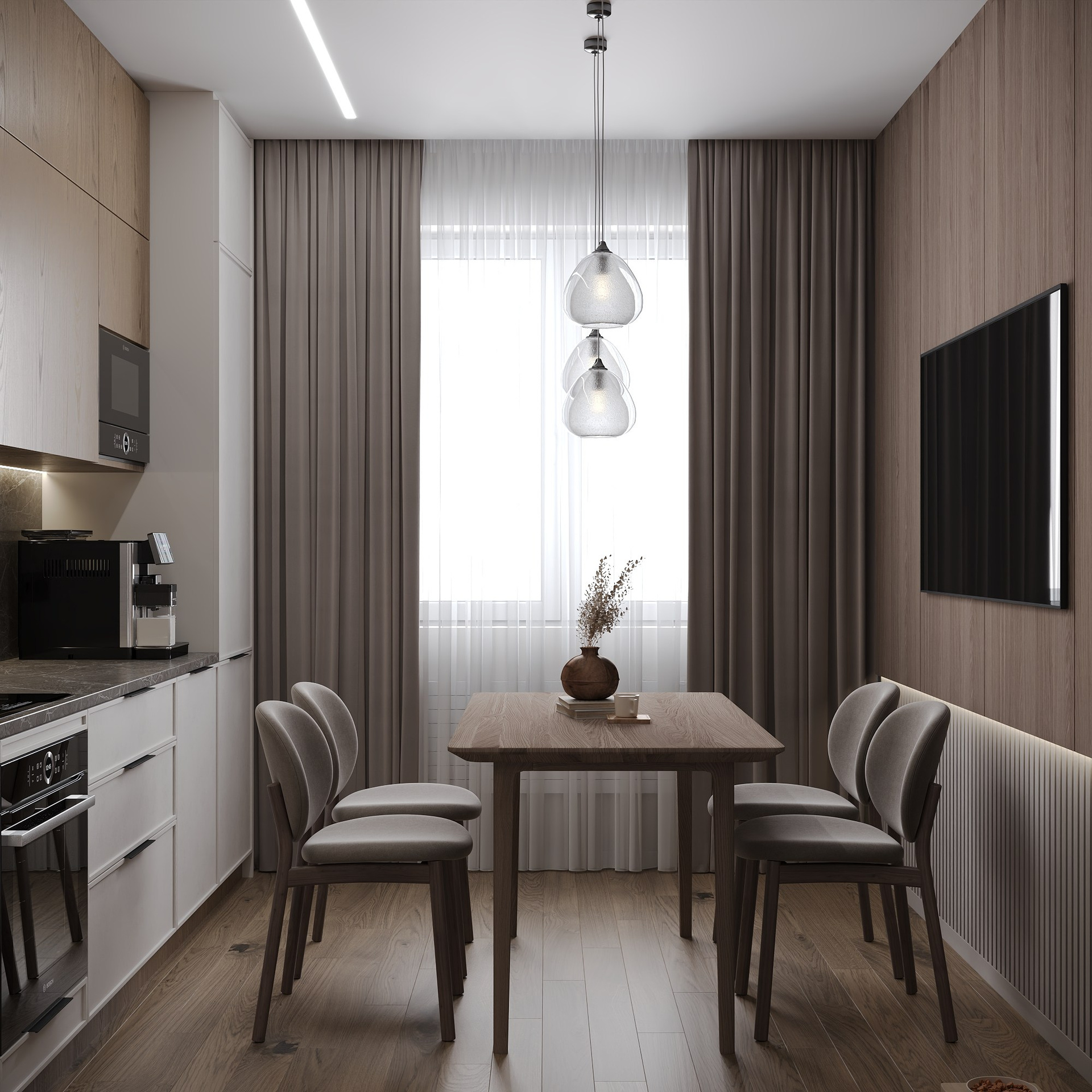 Интерьер сочетает скандинавскую эстетику с практичными решениями для работы, отдыха и активного образа жизни владельца.