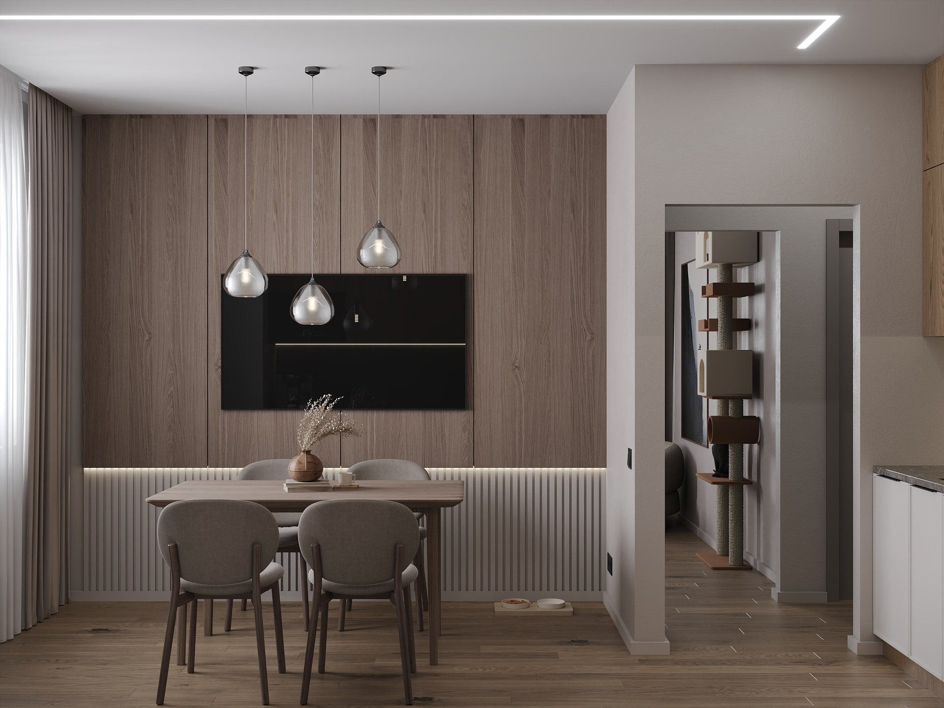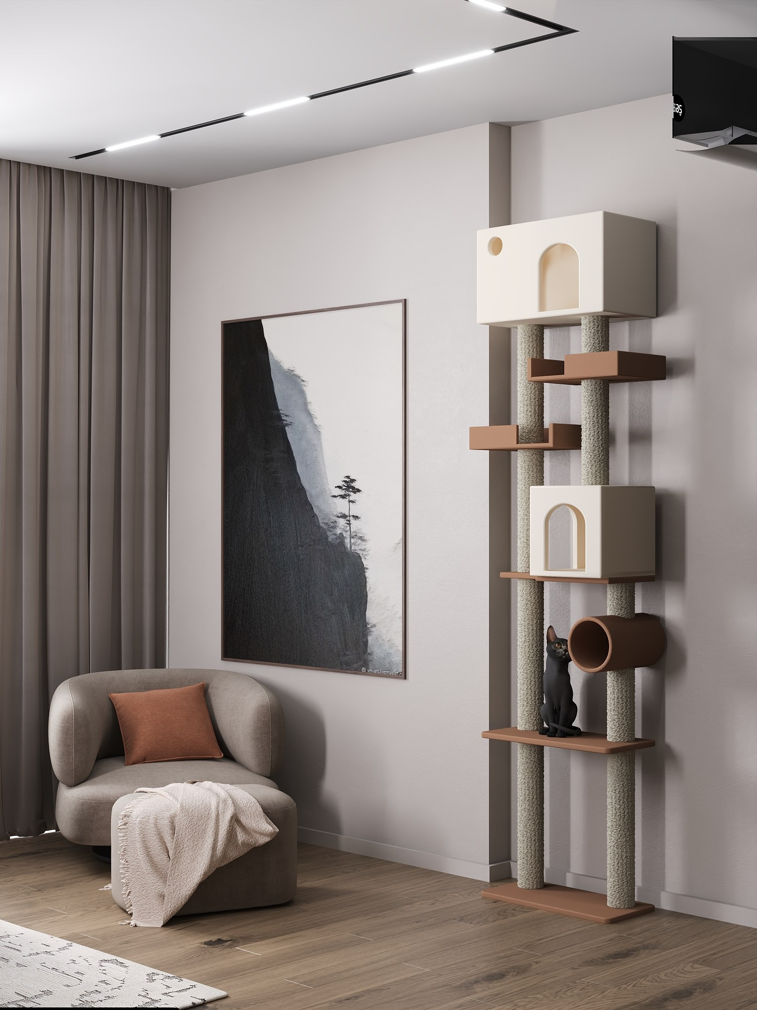 Для кошки организованы специальные зоны: комплекс для лазания в гостиной и автоматическая поилка.