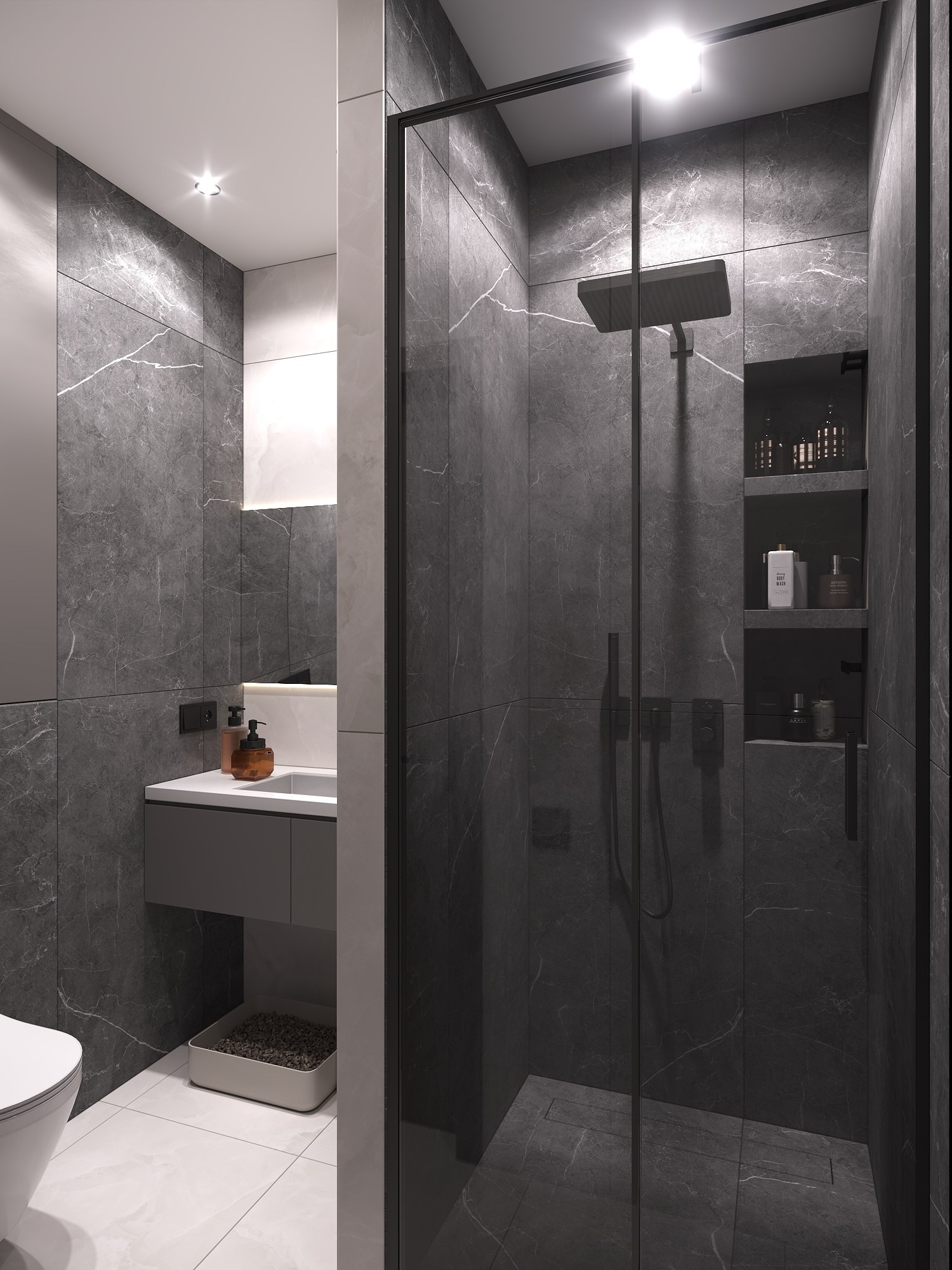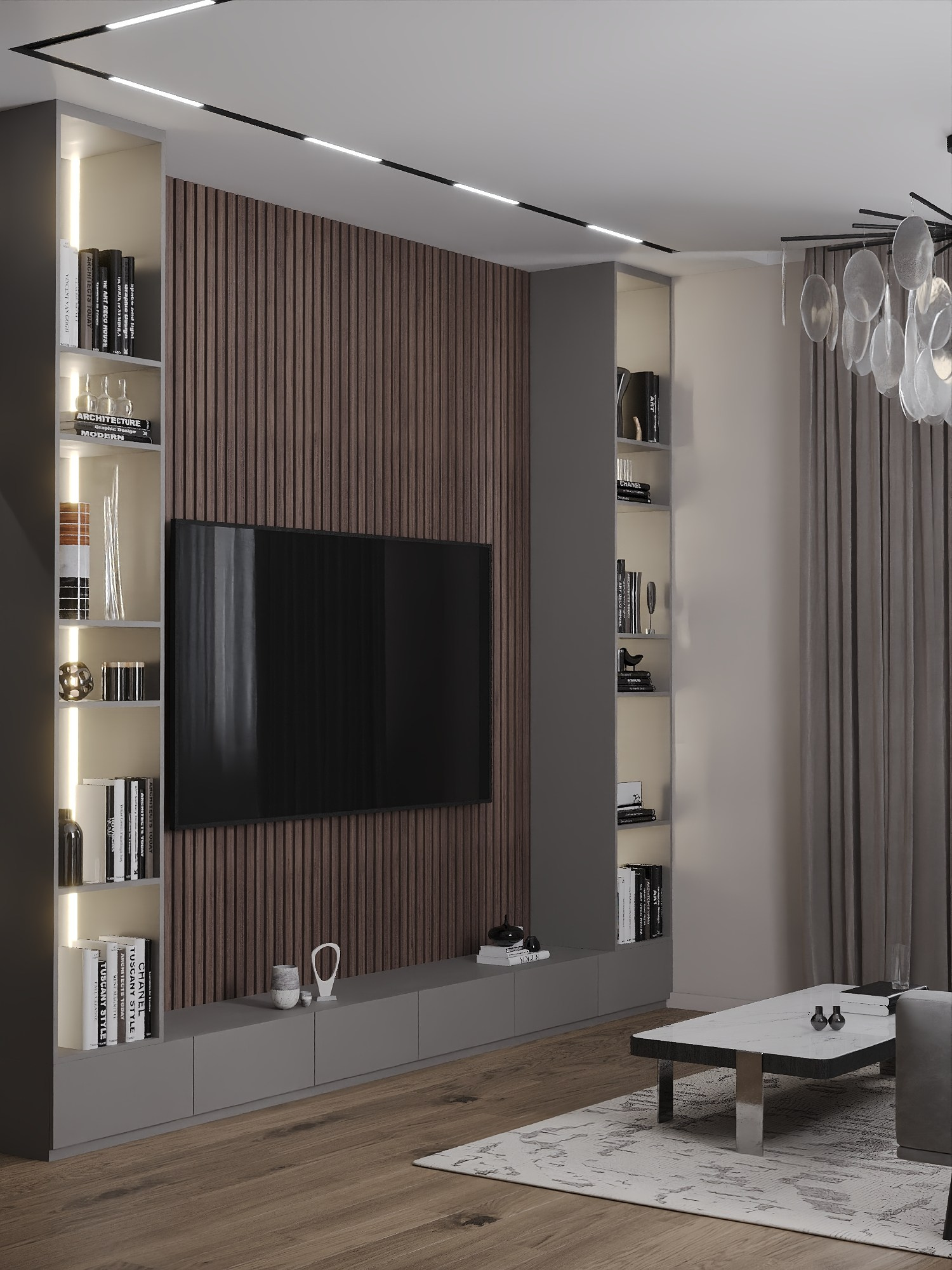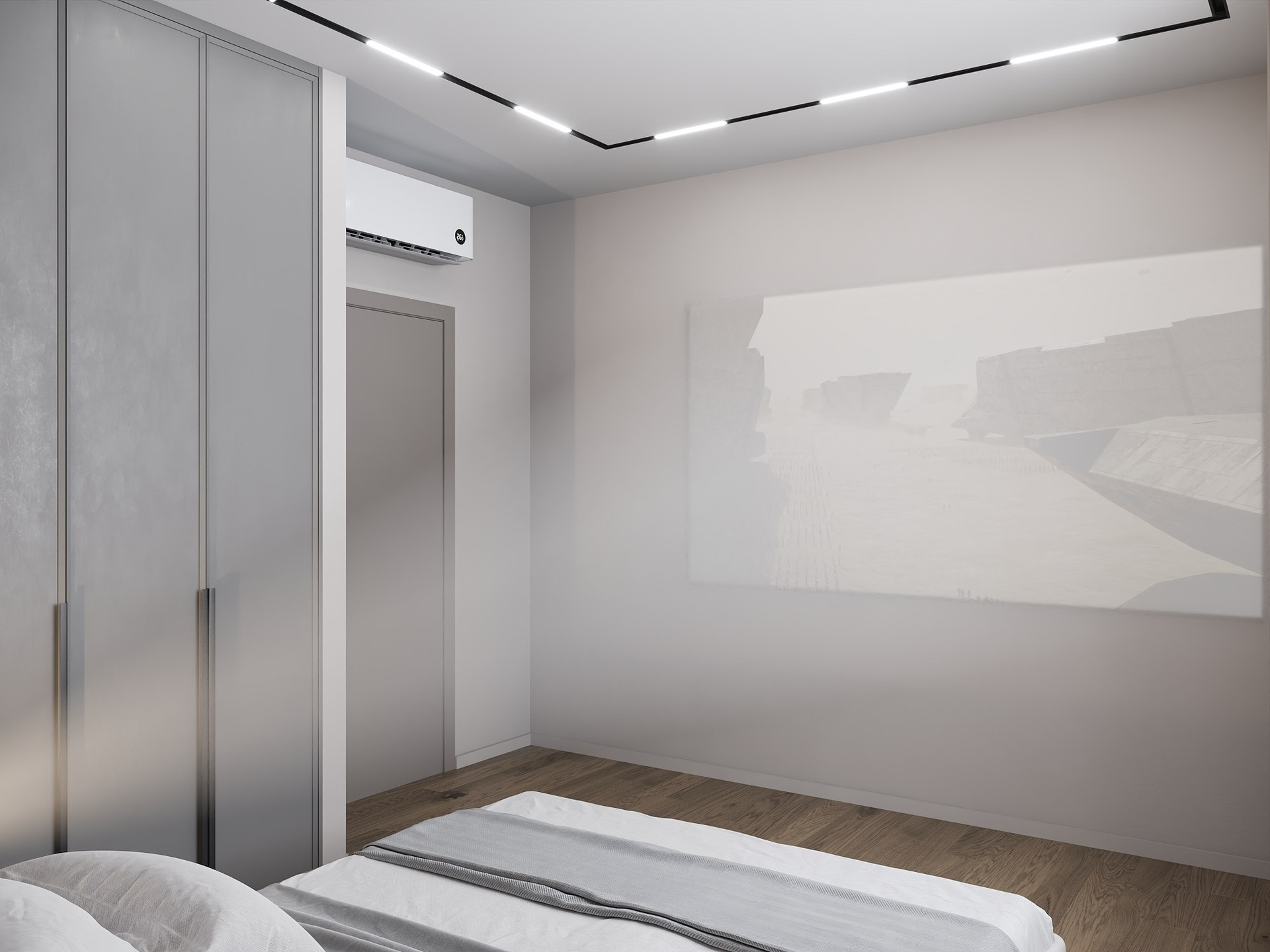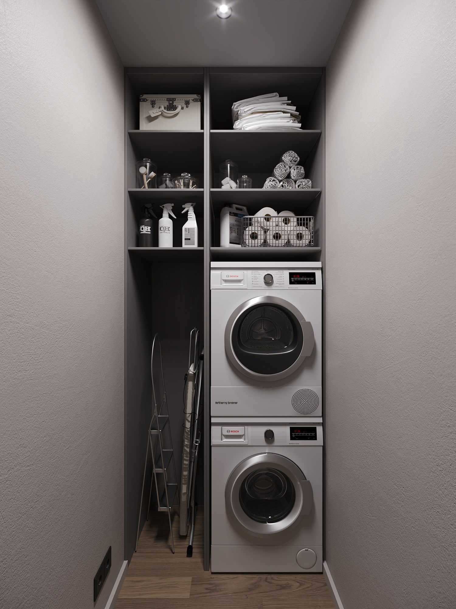 В спальне установлен проектор, в гостиной — телевизор, в санузле реализована душевая кабина и стирально-сушильный блок.