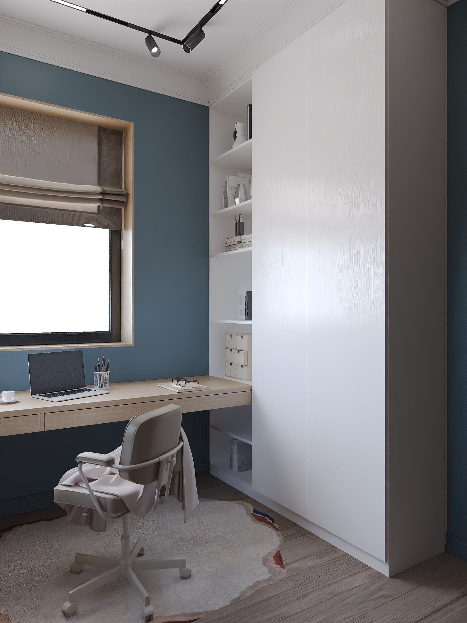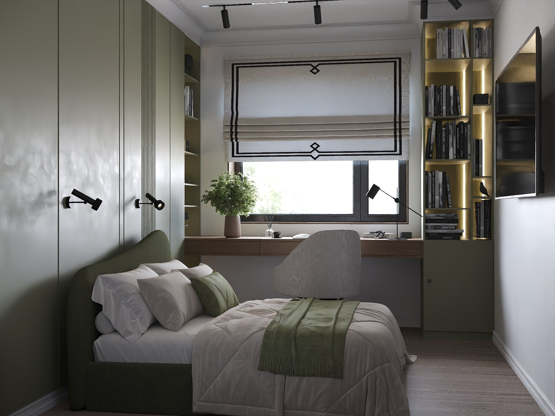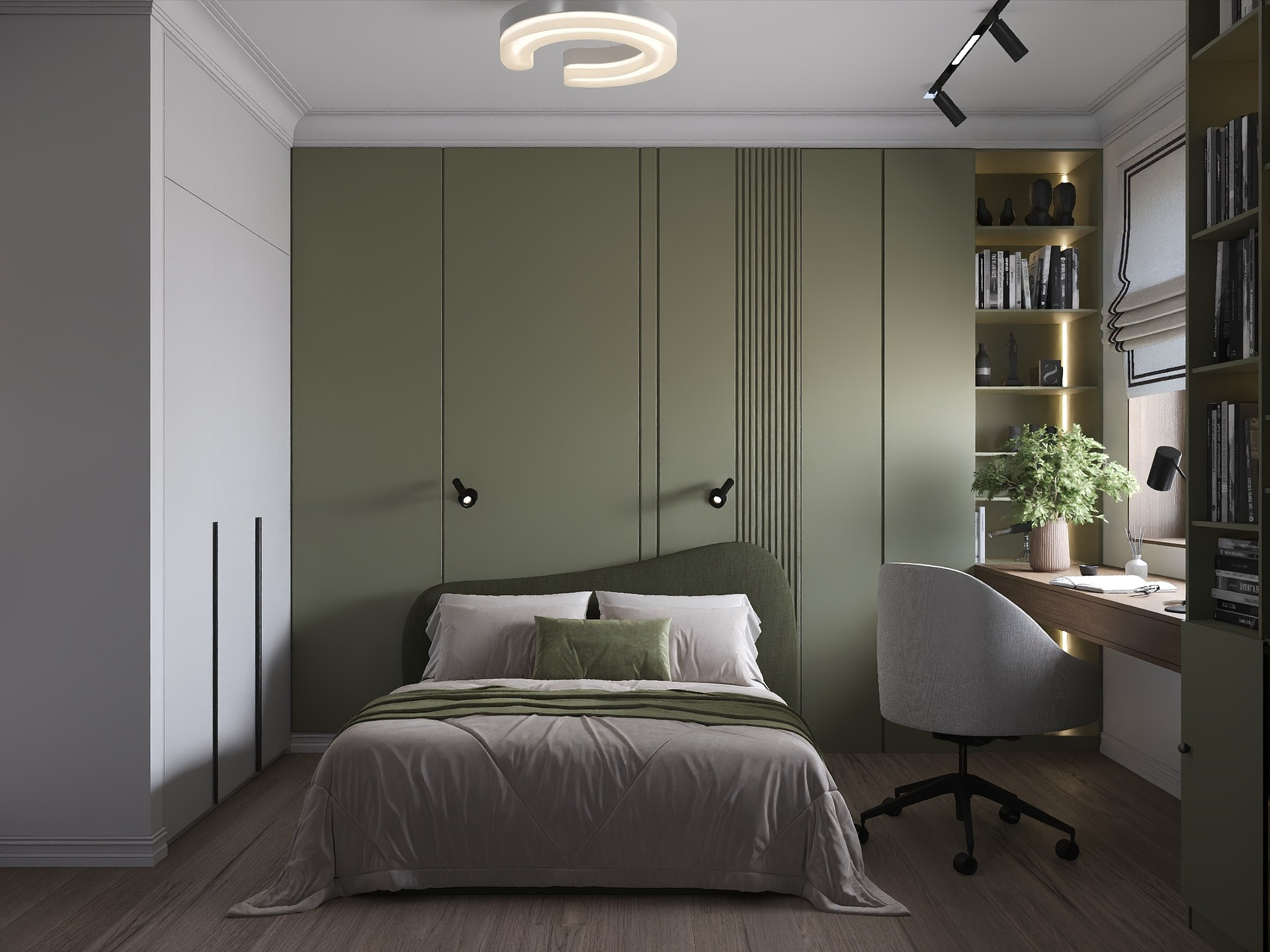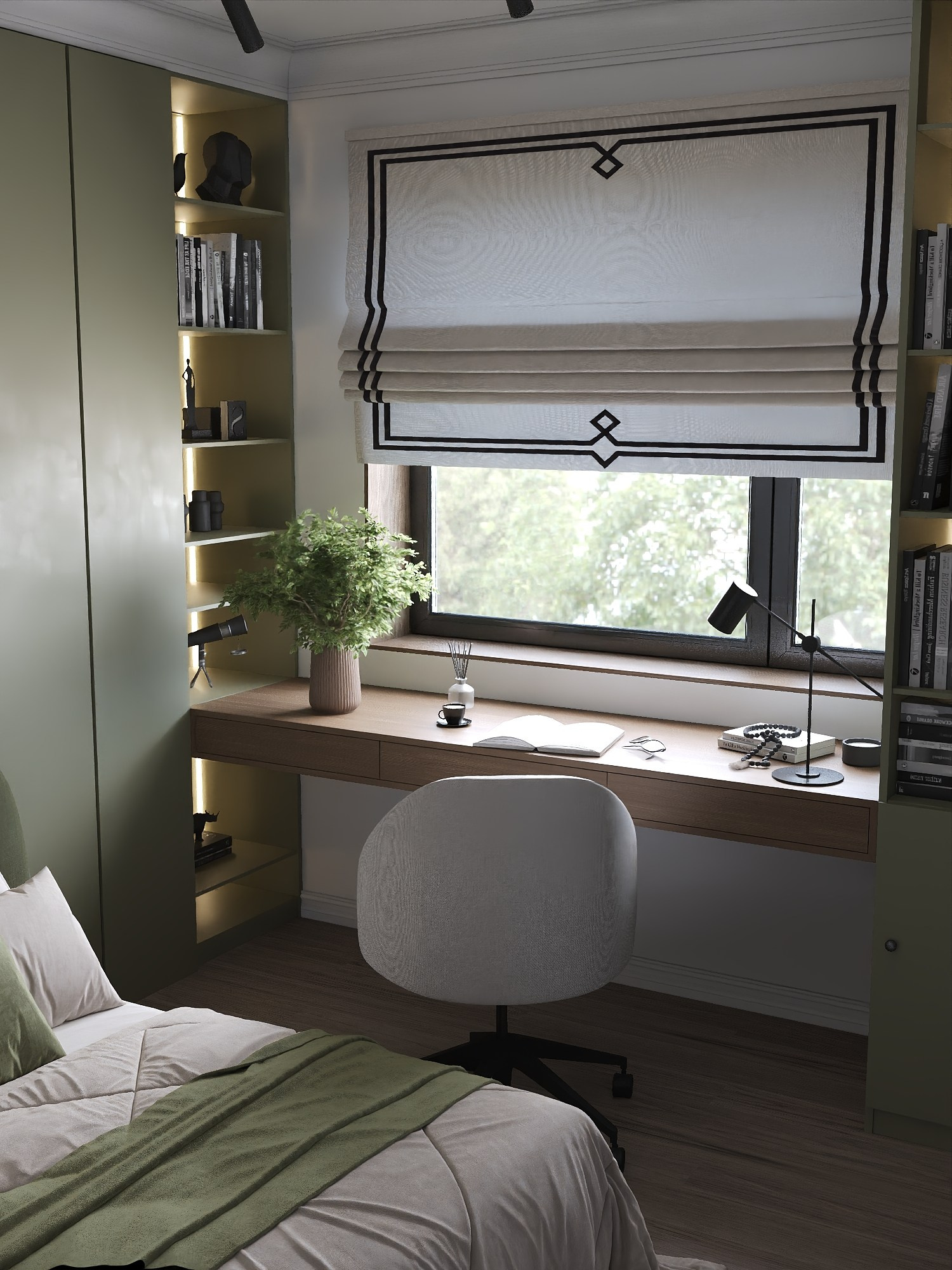 Для дочери создана многофункциональная комната в оливковой палитре с рабочим столом и системой хранения, а кабинет и гостевая спальня выполнены в сдержанной эстетике с акцентом на практичность.