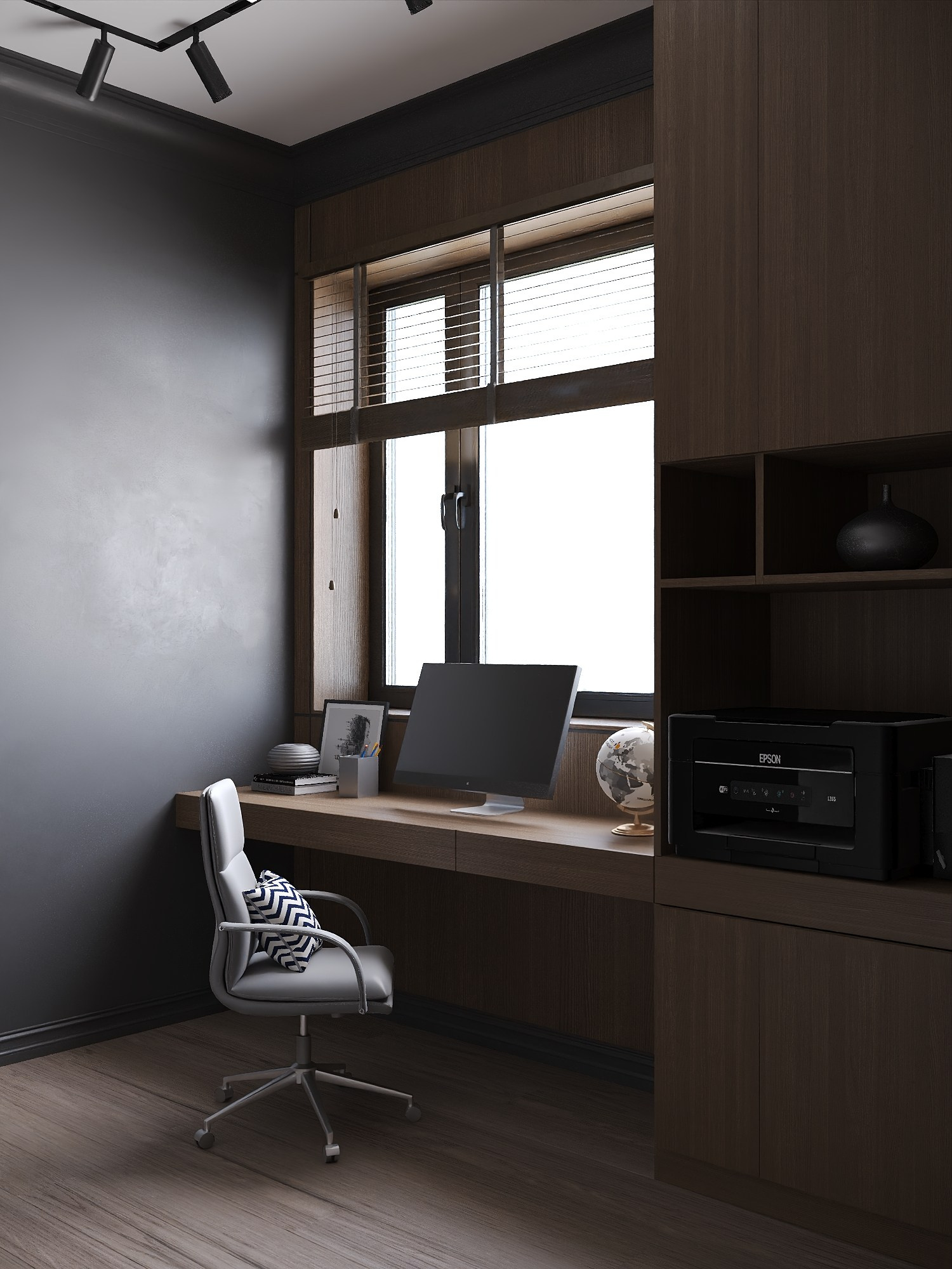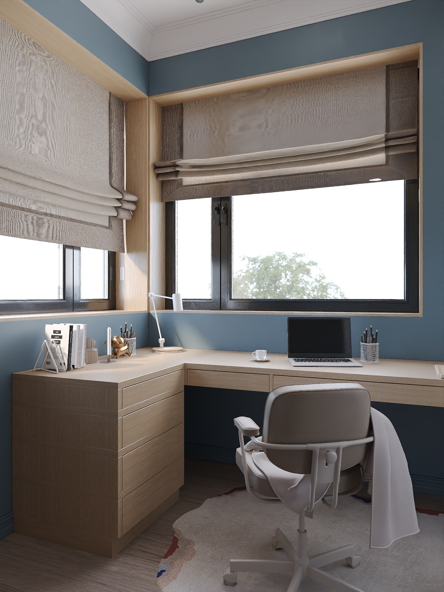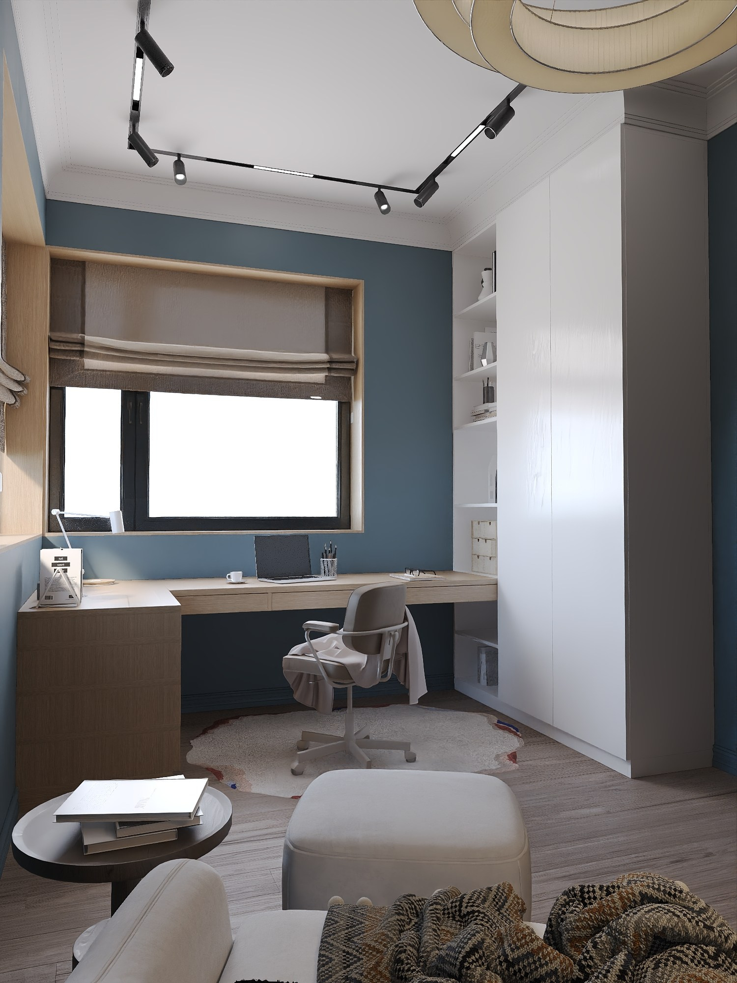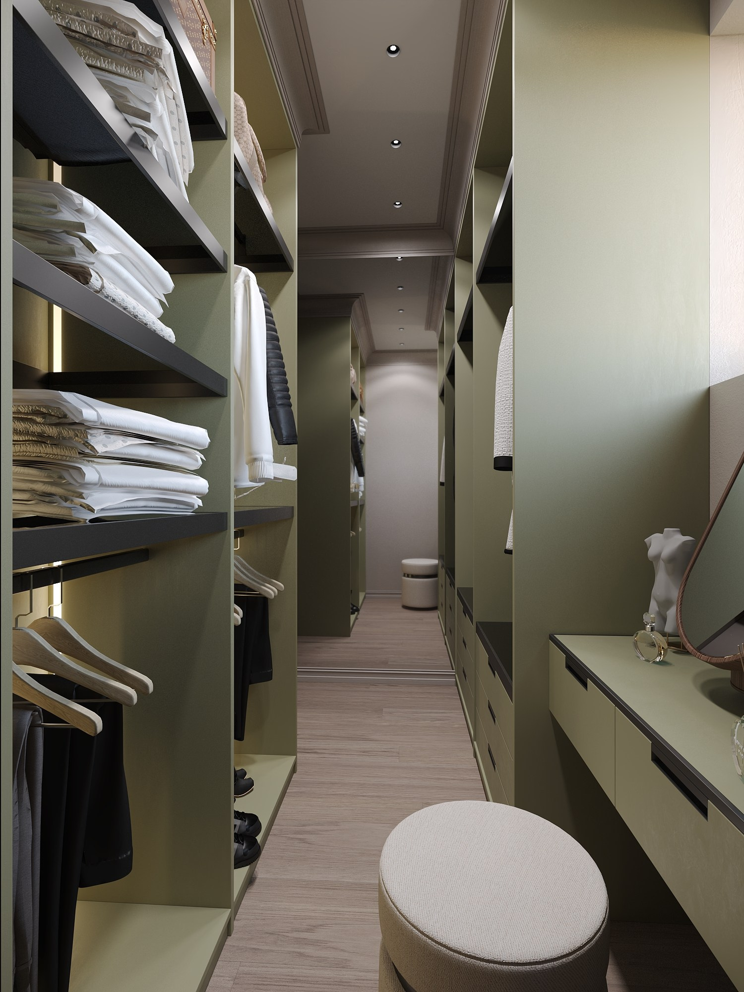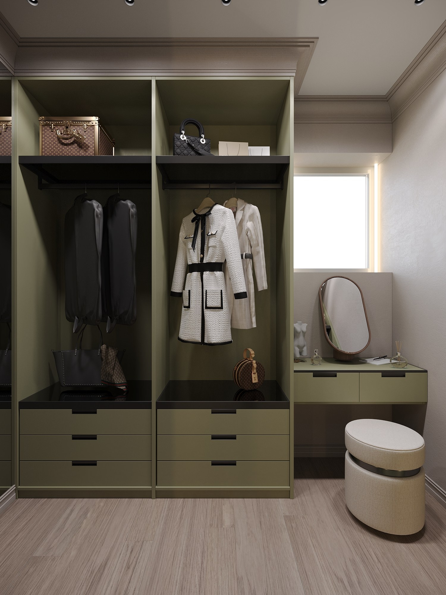 Для дочери создана многофункциональная комната в оливковой палитре с рабочим столом и системой хранения, а кабинет и гостевая спальня выполнены в сдержанной эстетике с акцентом на практичность.