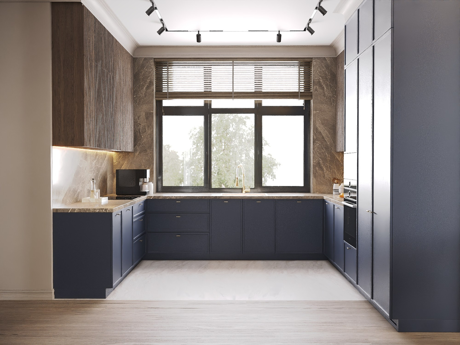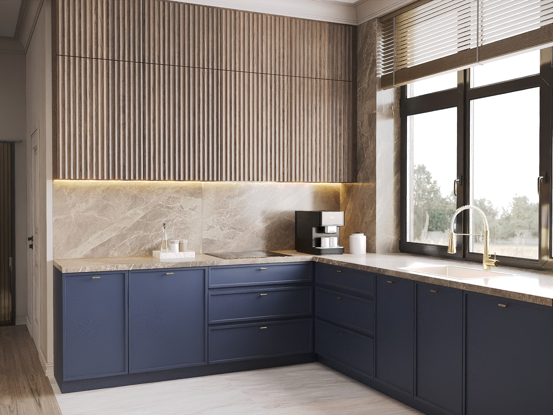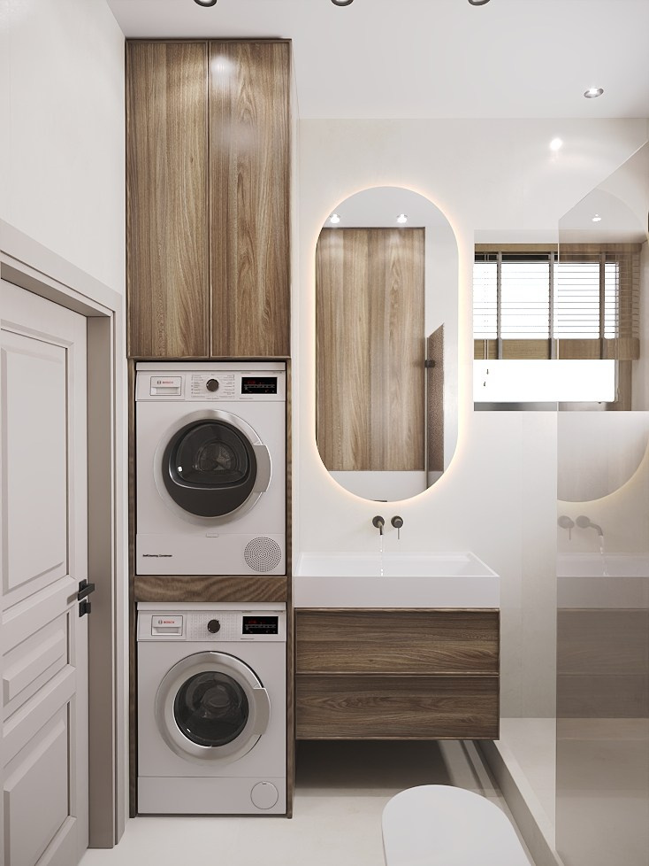 Разработана концепция современной классики с элементами модерна, где основное внимание уделено гостиной-кухне.