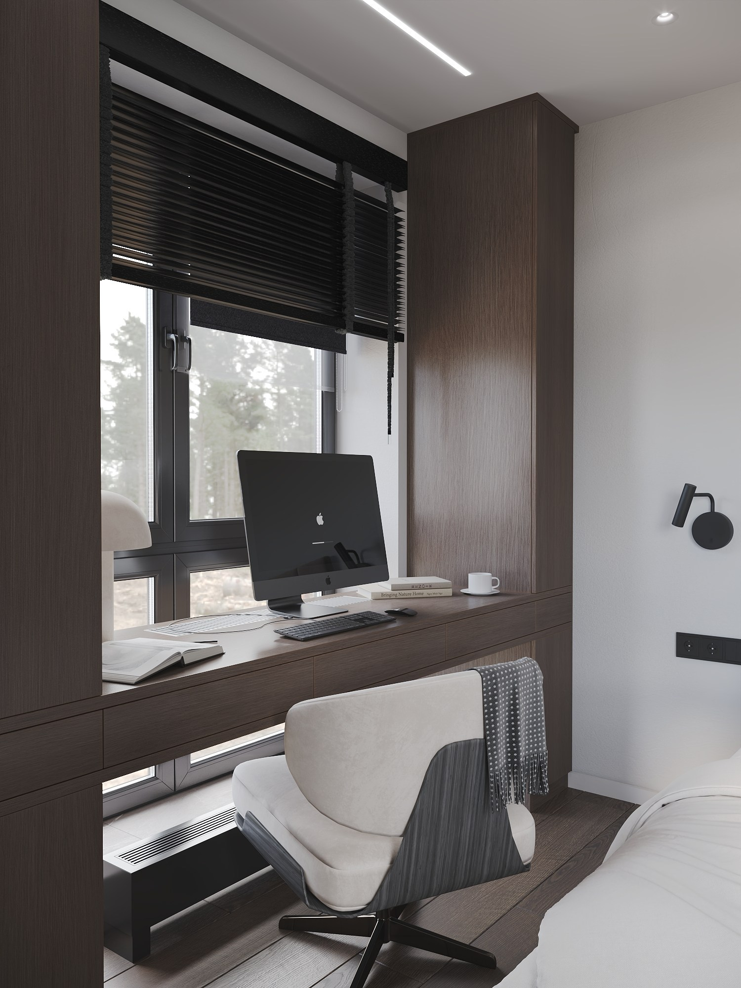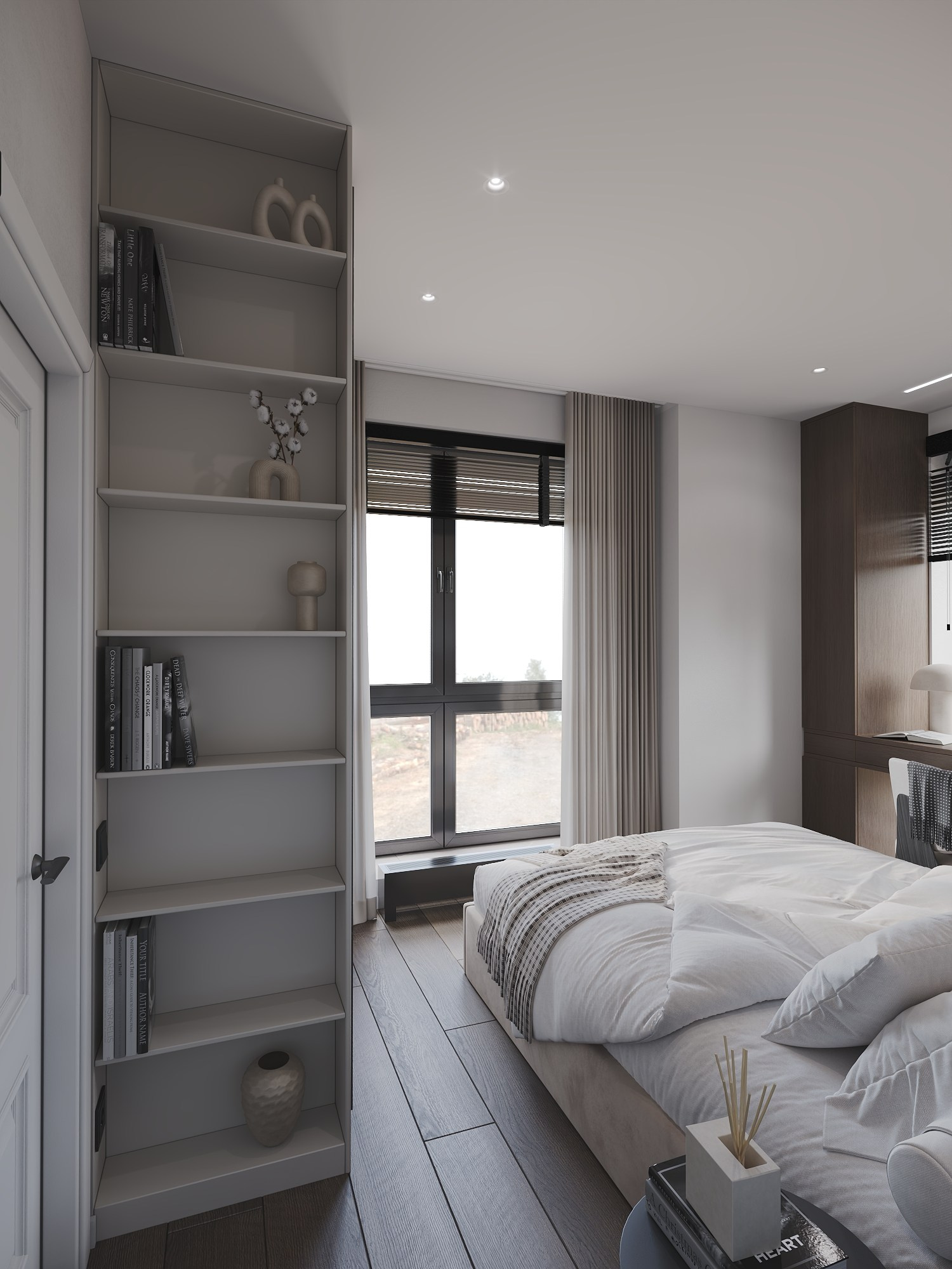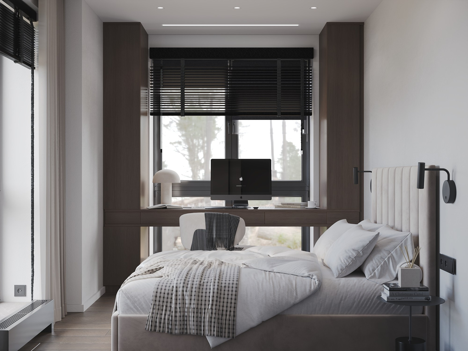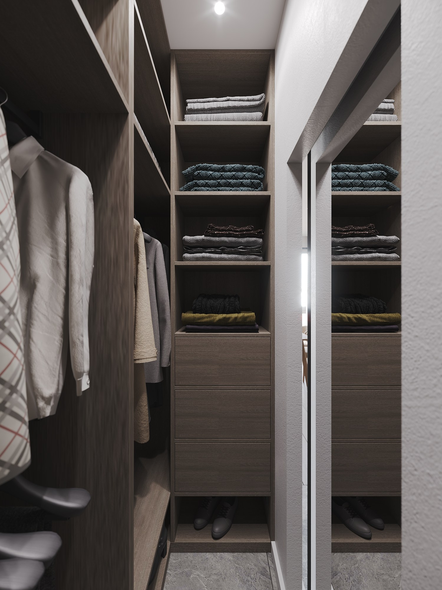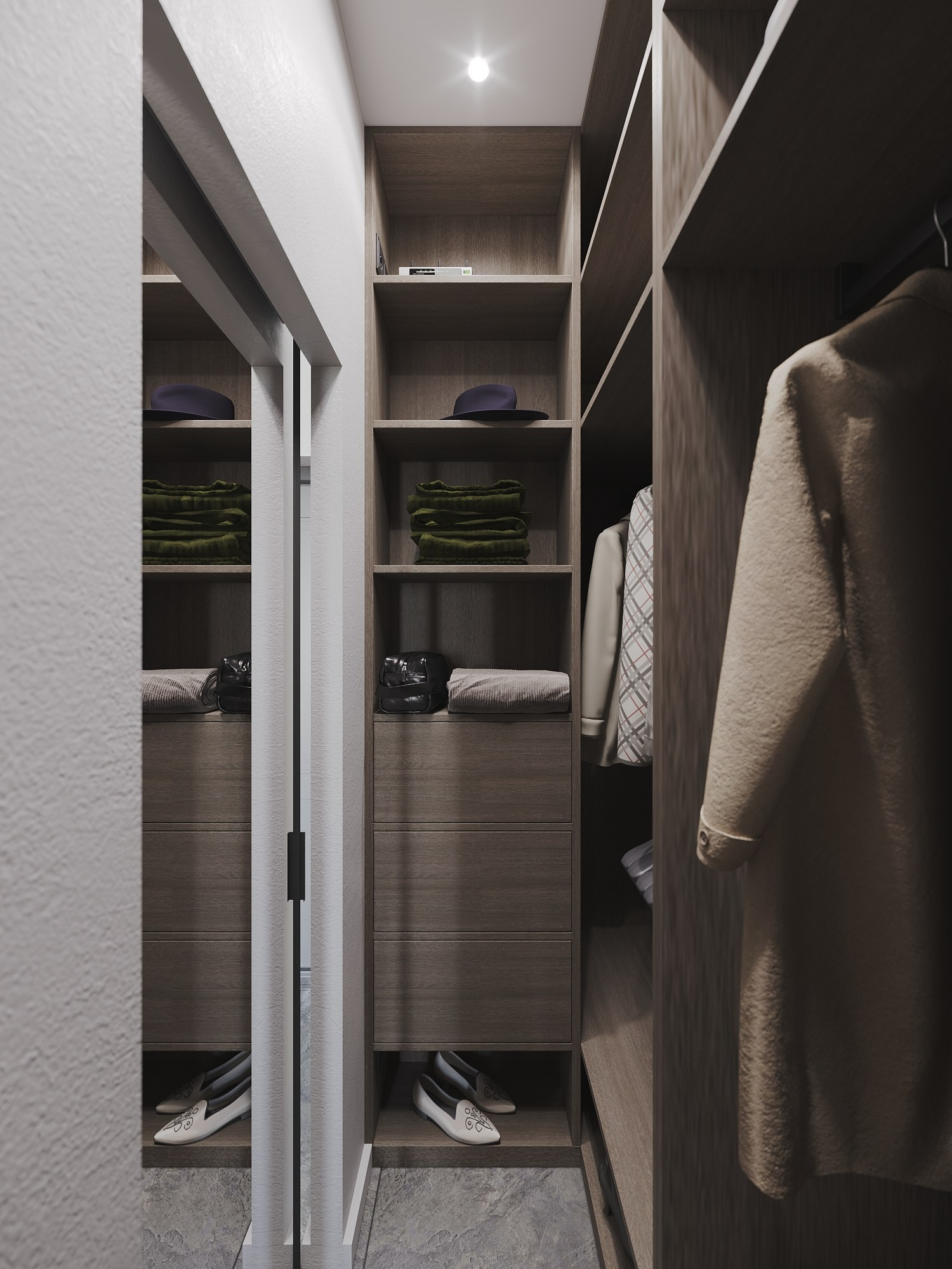 Реализована многоуровневая система хранения: гардероб разделен на зоны, спальня оборудована встроенными шкафами, полками у окна и местом под кроватью.