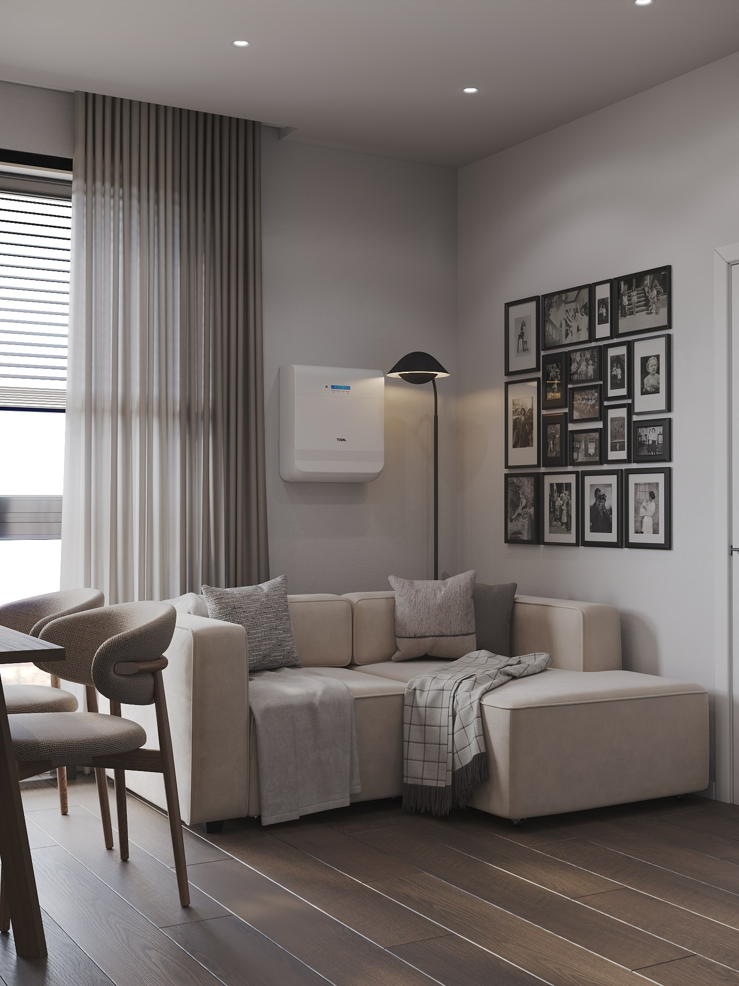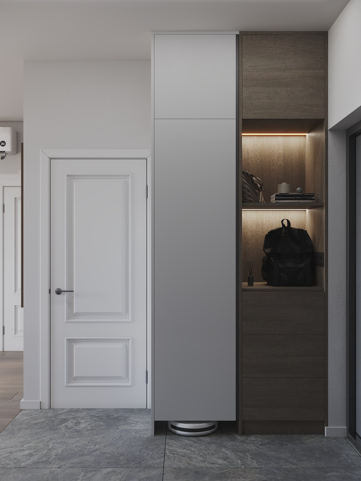 — на 2-х квадратных метрах прихожей разместить шкаф, зеркало, полки и станцию для робота-пылесоса.