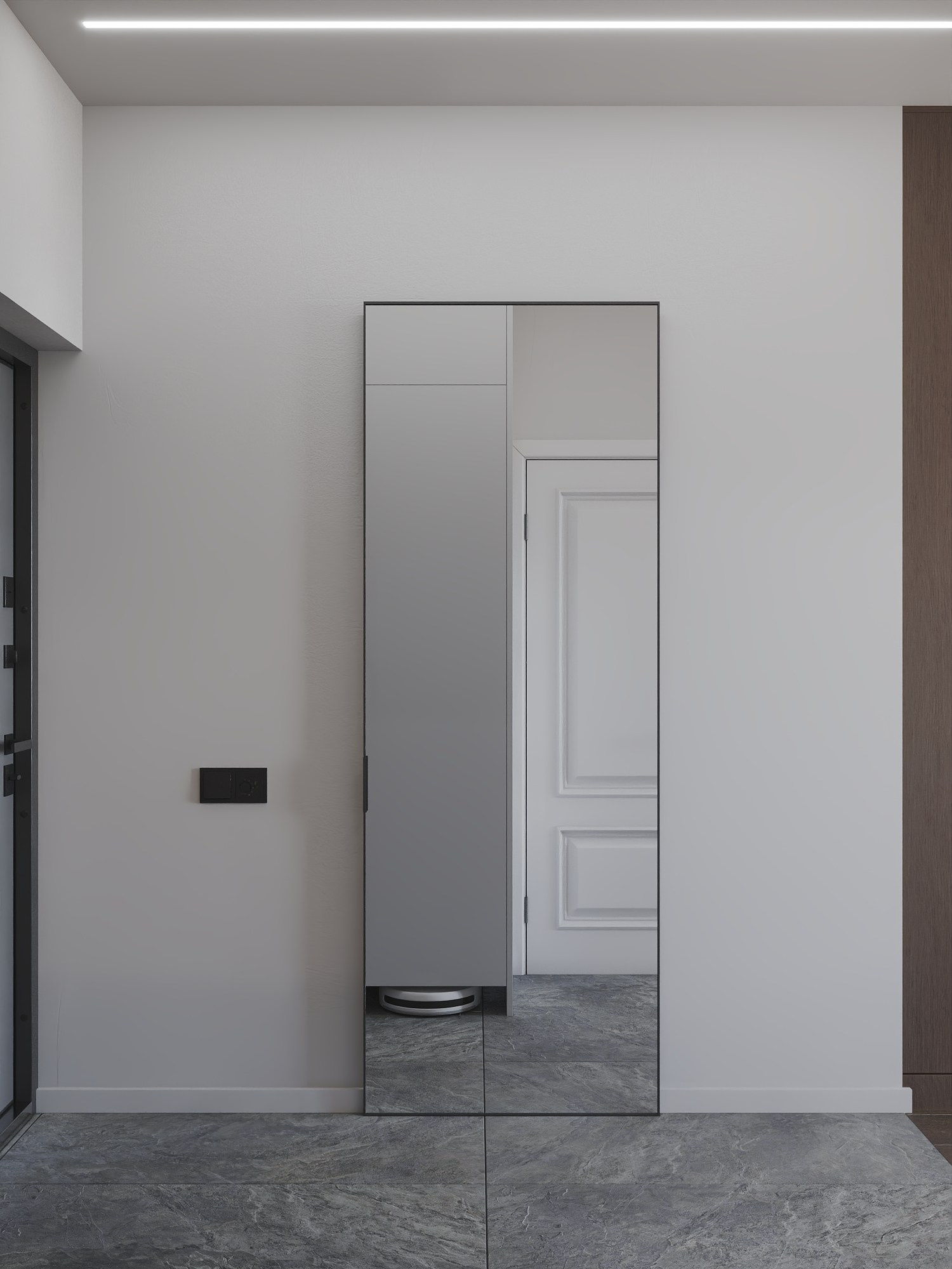 В прихожей размещен многофункциональный шкаф с местами для обуви, рюкзака и техники, установлено зеркало и скрытый электрощит.