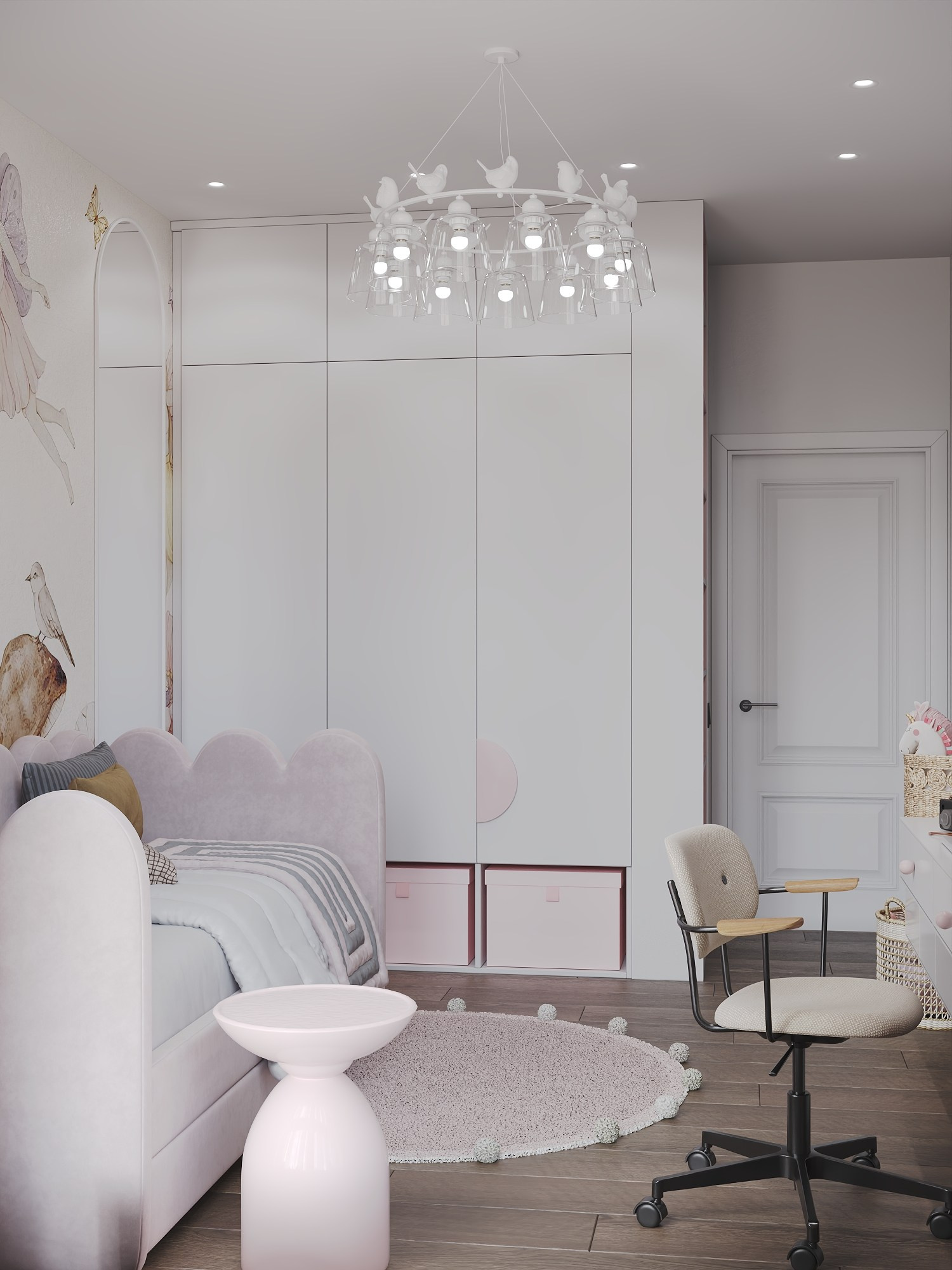 В детской добавлены низкие полки и ручки для самостоятельного использования ребёнком, предусмотрена зона для будущего рабочего стола.