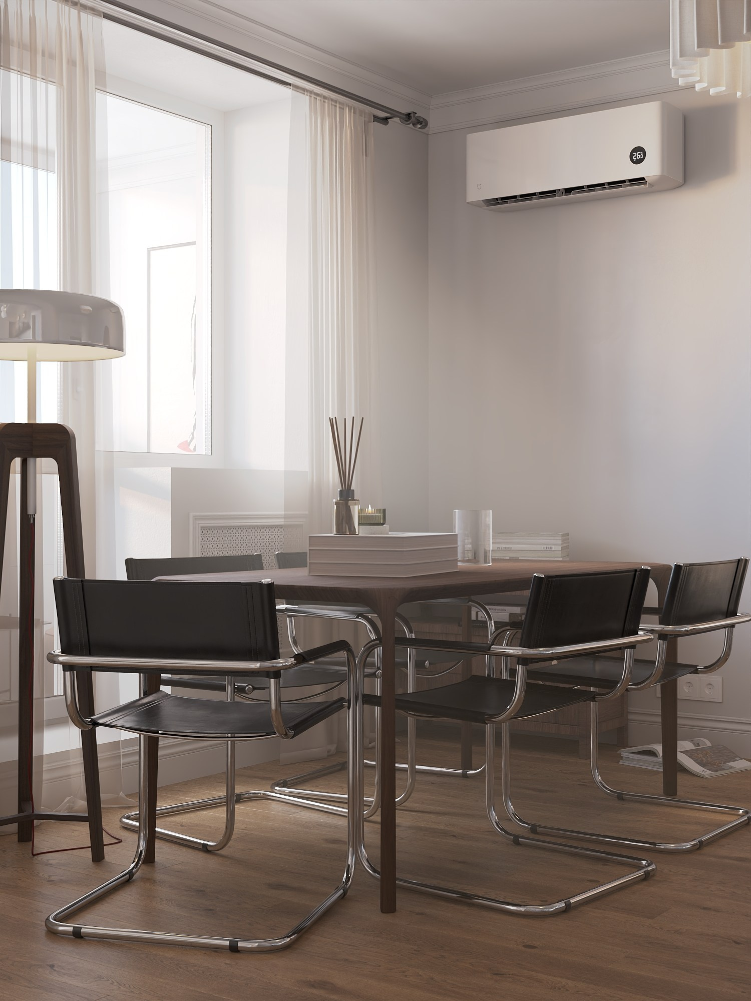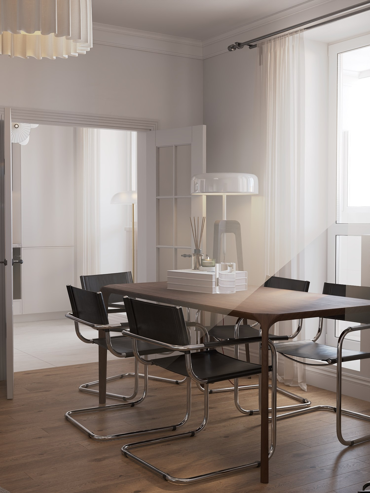 Реализован интерьер в смешанном стиле, где классика (деревянный стол, люстра-«рояль») сочетается с современными элементами (металлические стулья, стеклянные поверхности).