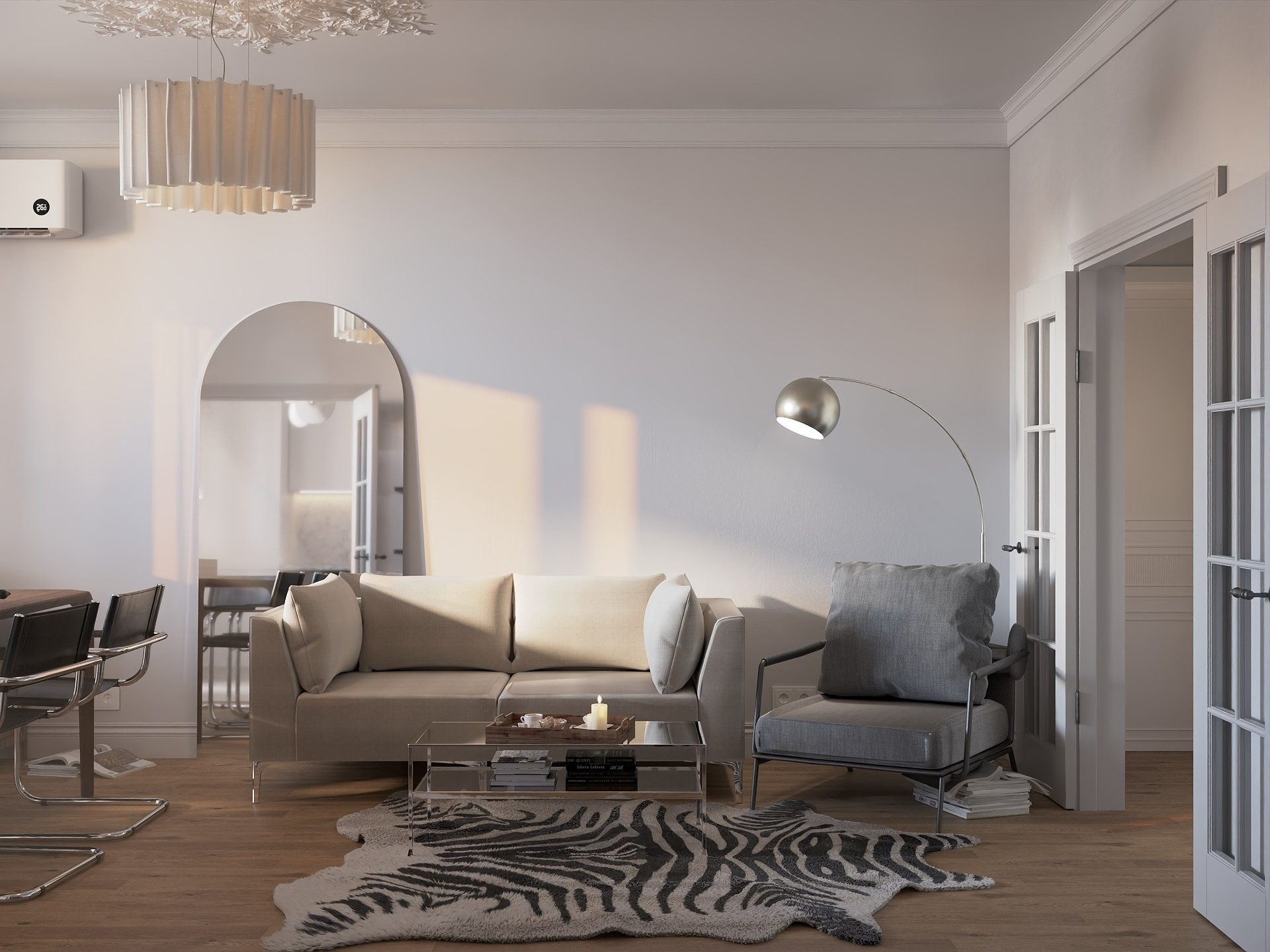 — эклектичное сочетание классических и современных элементов, а также использование смелых акцентов — рисунок кожи зебры, повторяющийся на ковре и картинах, металла, стекла и дерева.